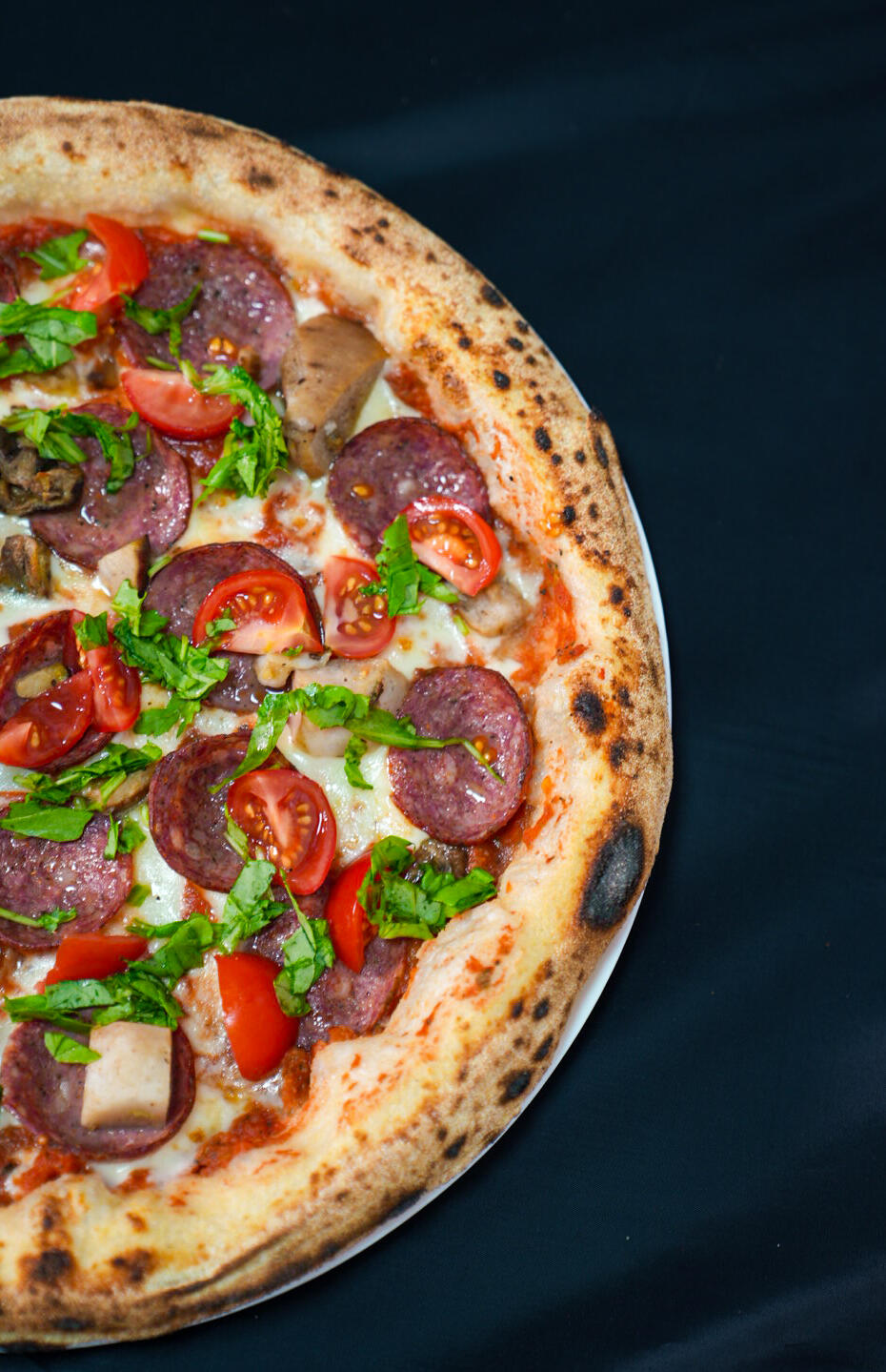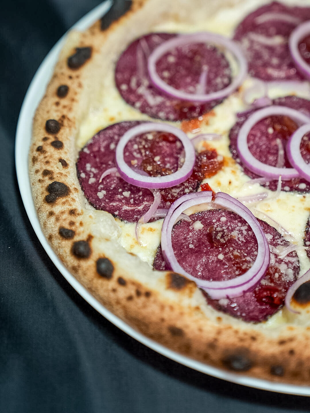 Blat, sos de rosii, mozzarella, salam ventricina, grana padano