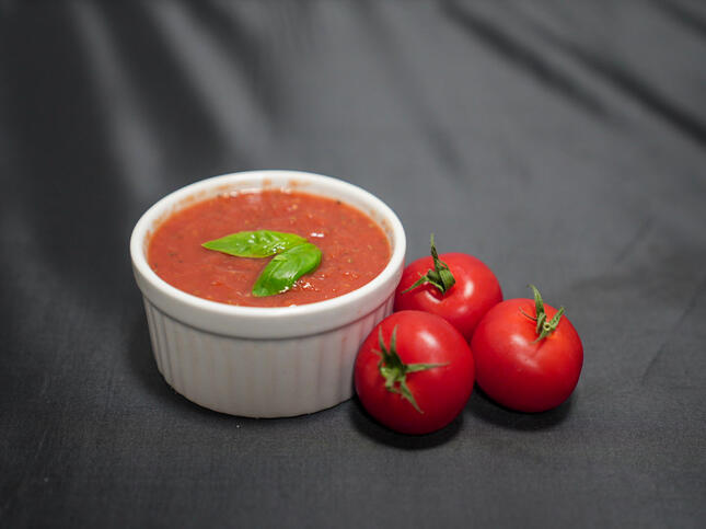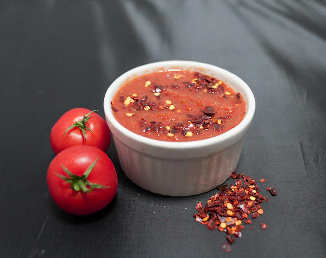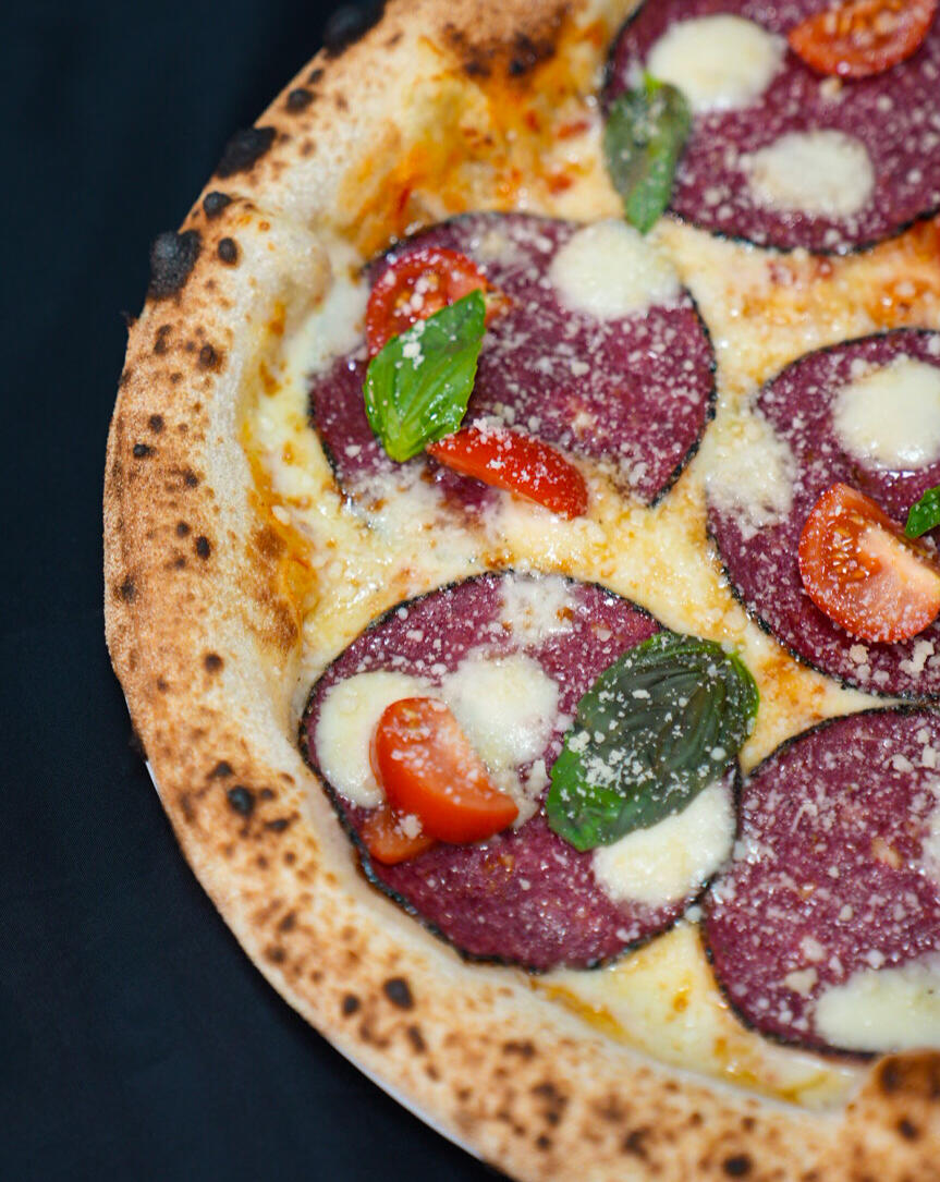 Blat, dulceață de ardei iute, mozzarella, salam de cerb, roșii cherry, busuioc, parmezan.