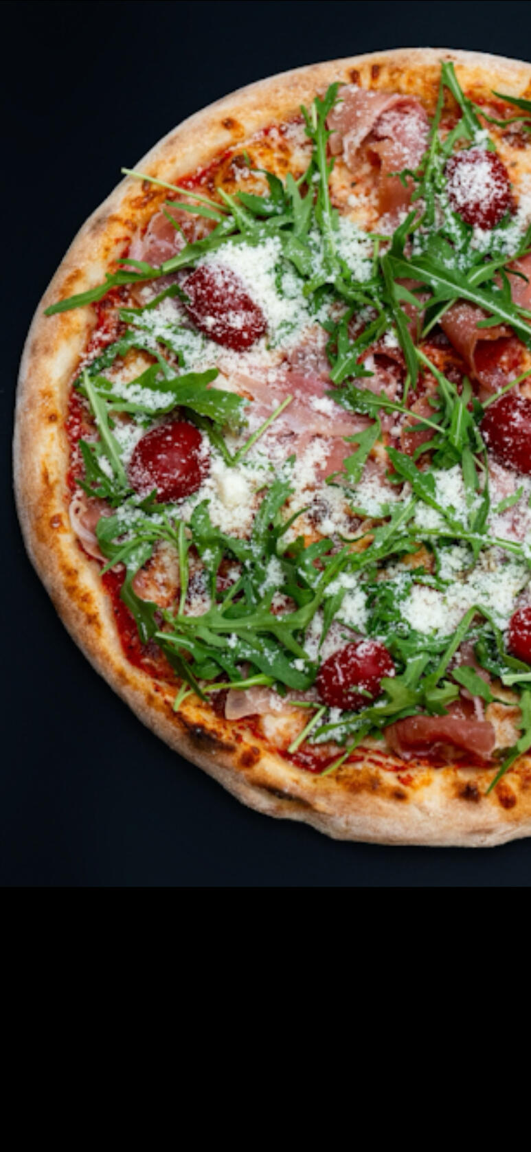 Blat, sos de rosii, mozzarella, prosciutto crudo, rucola, rosii cherry, parmezan