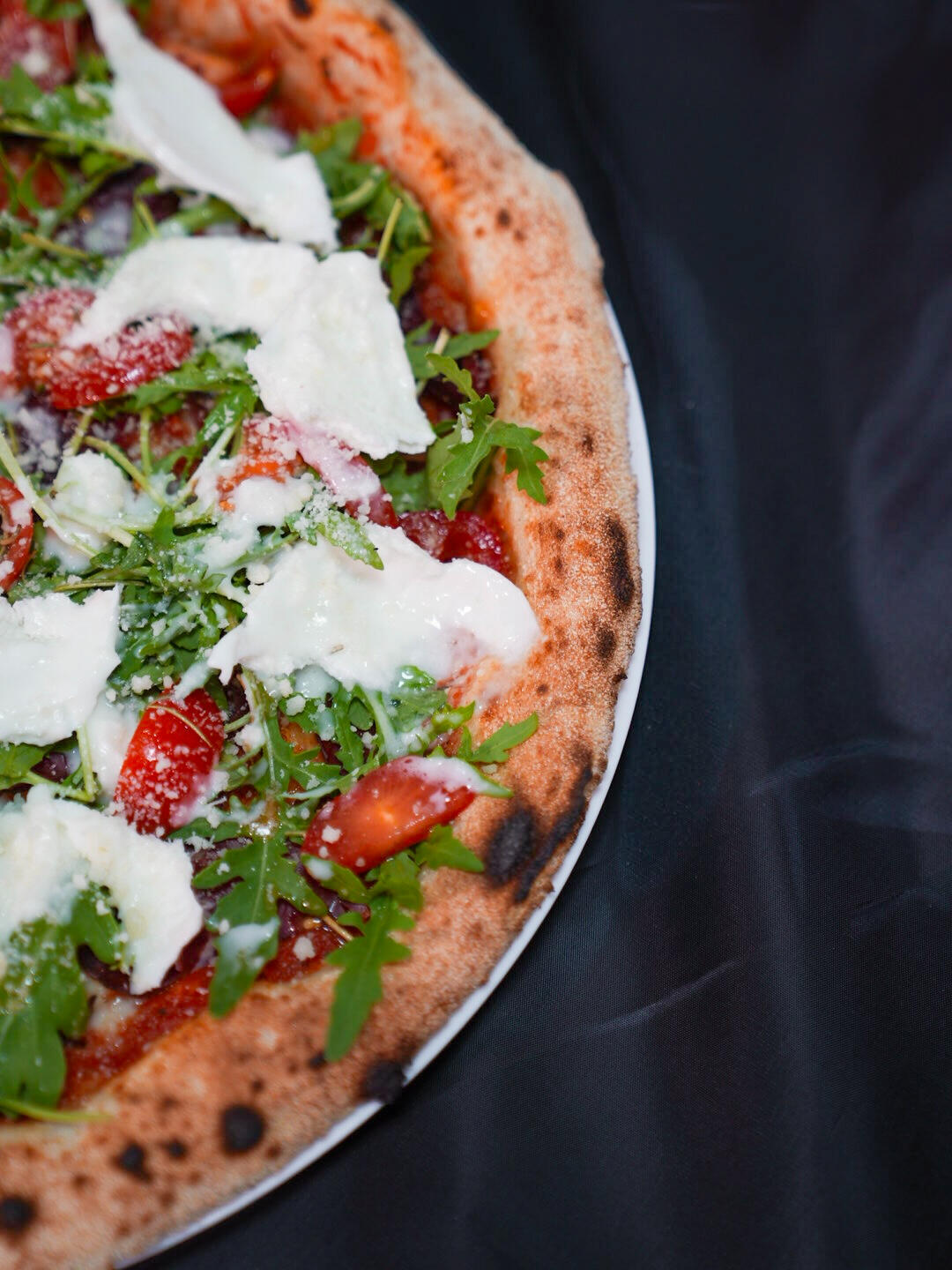 Blat, sos de roșii, pastramă de mistreț, rucola, roșii cherry, mozzarella di Bufala.