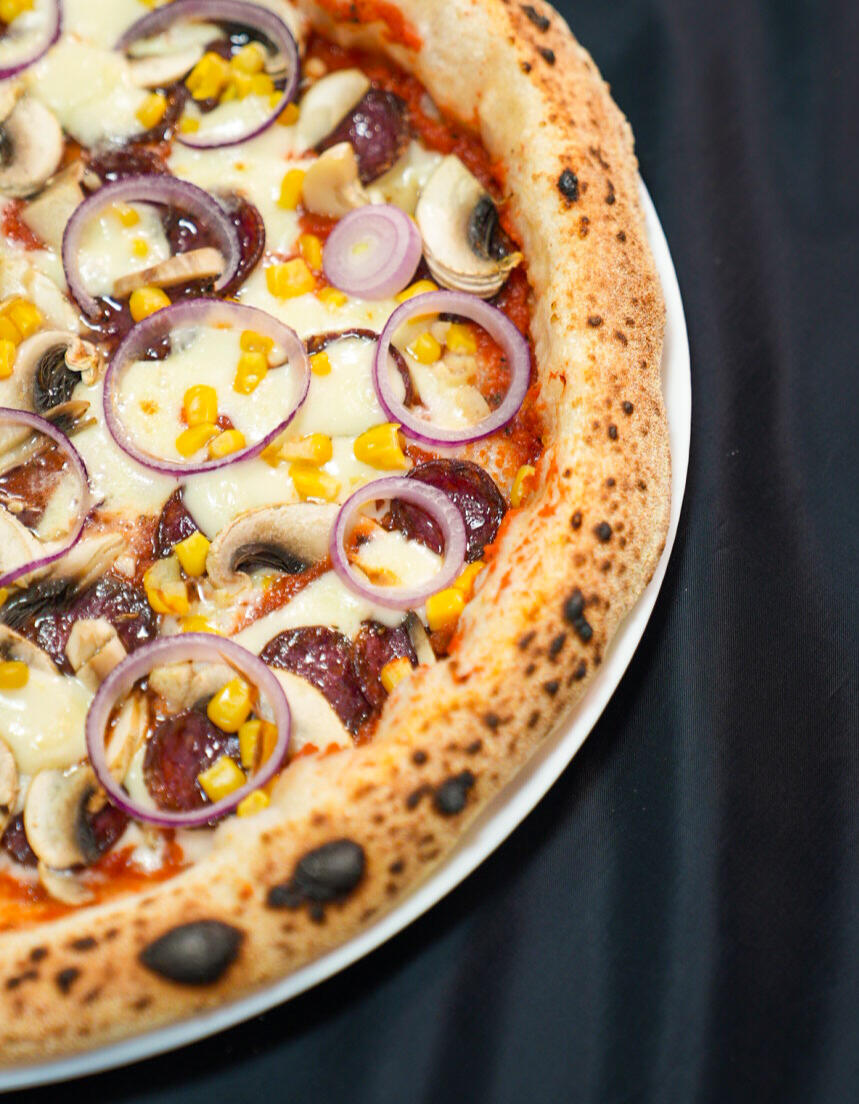 blat, mozzarella, sos de roșii, cârnați de cerb, ciuperci, emmentaler, porumb, ceapă roșie.