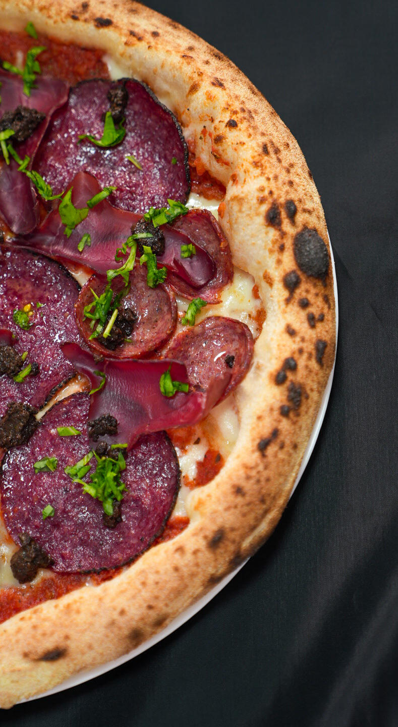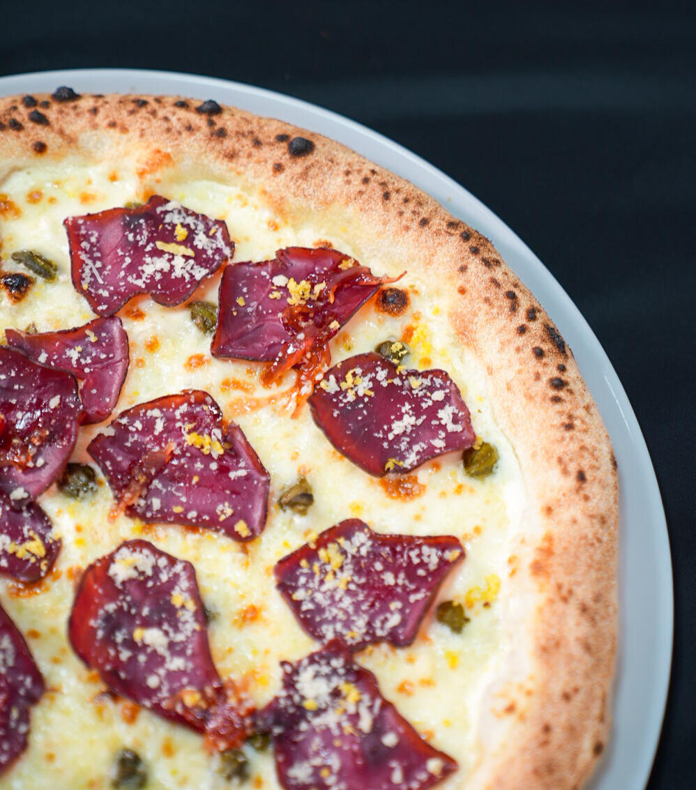 blat, sos de usturoi, mozzarella, capere, pastramă de cerb, parmezan, coajă de lime