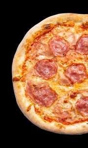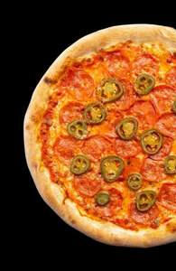 Blat, sos de rosii, mozzarella, salam salsicia picant, ardei jalapeno
