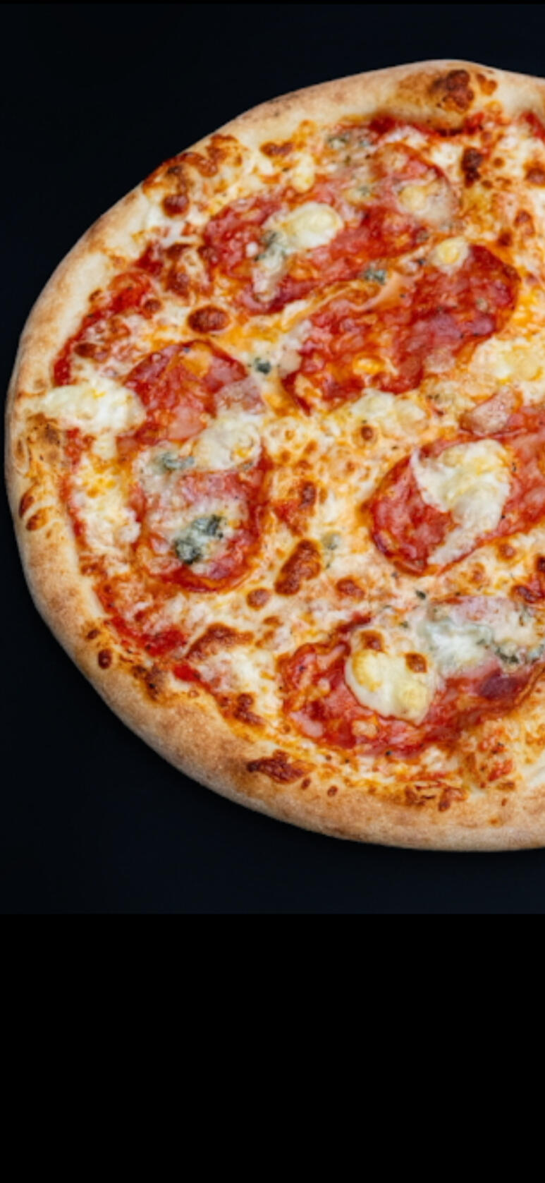 Blat, sos de rosii, mozzarella, emmentaler, gorgonzola, parmezan, salam spianatta picant.
